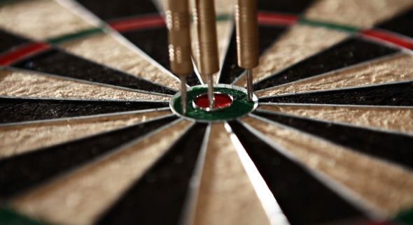 Dartboard with three darts hitting the bull’s eye.
