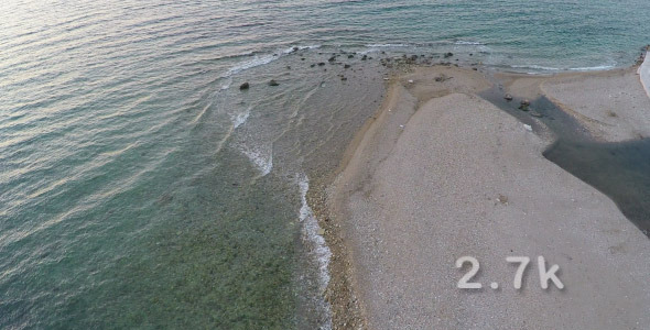 Aerial view of a sandy seashore with soft waves.