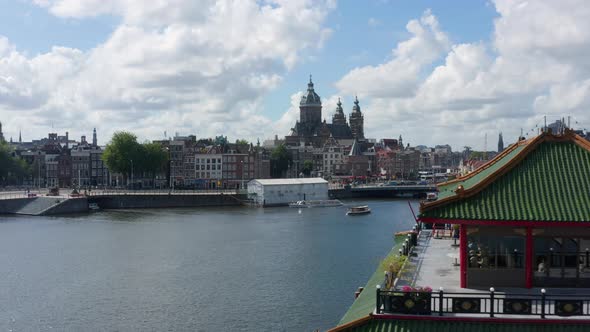 Birds View of Amsterdam Canal River with Boat Traffic and Old Cathedral