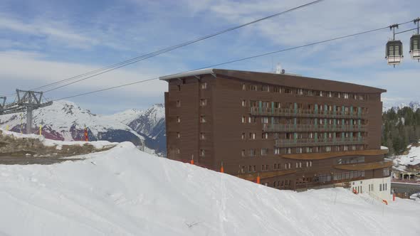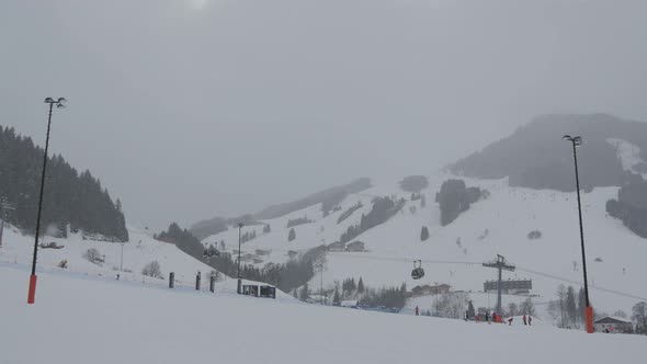 Ice flyers, cable cars, and chair lifts going up an down the snowy slopes of a skiing destination lo