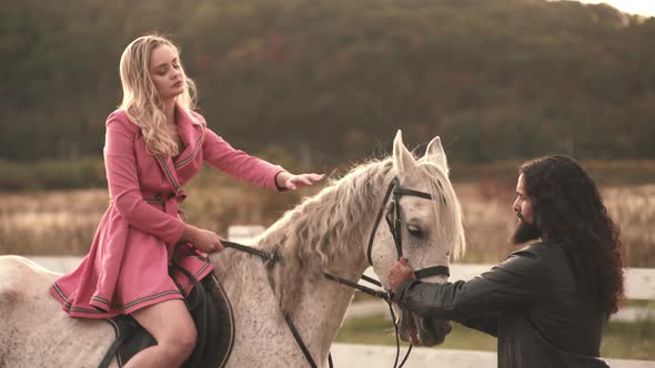 Slow Motion Young Happy Girl Caressing Her Pretty White Horse