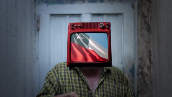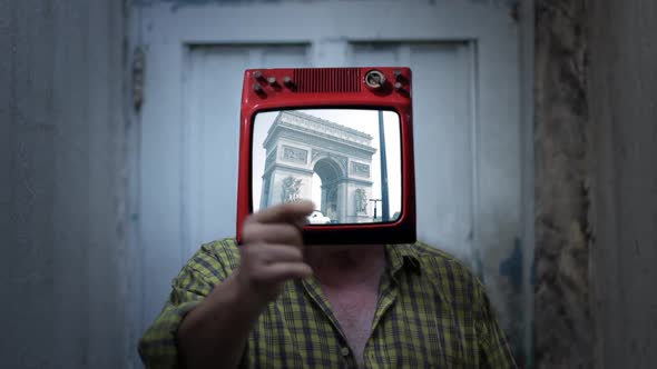 Man with Old TV instead of Head, showing the Flag of England on Screen.