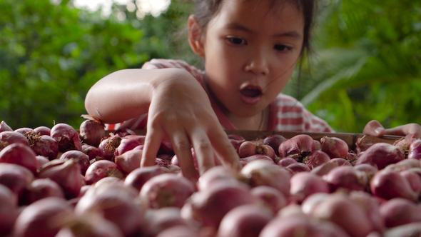 Thai girl is holding shallots and showing
