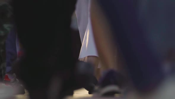 Legs of a crowd walking along Nevsky Prospect on a warm summer Sunday evening