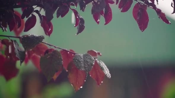 Pissardi plum branch with red leaves covered with drops during a summer rain